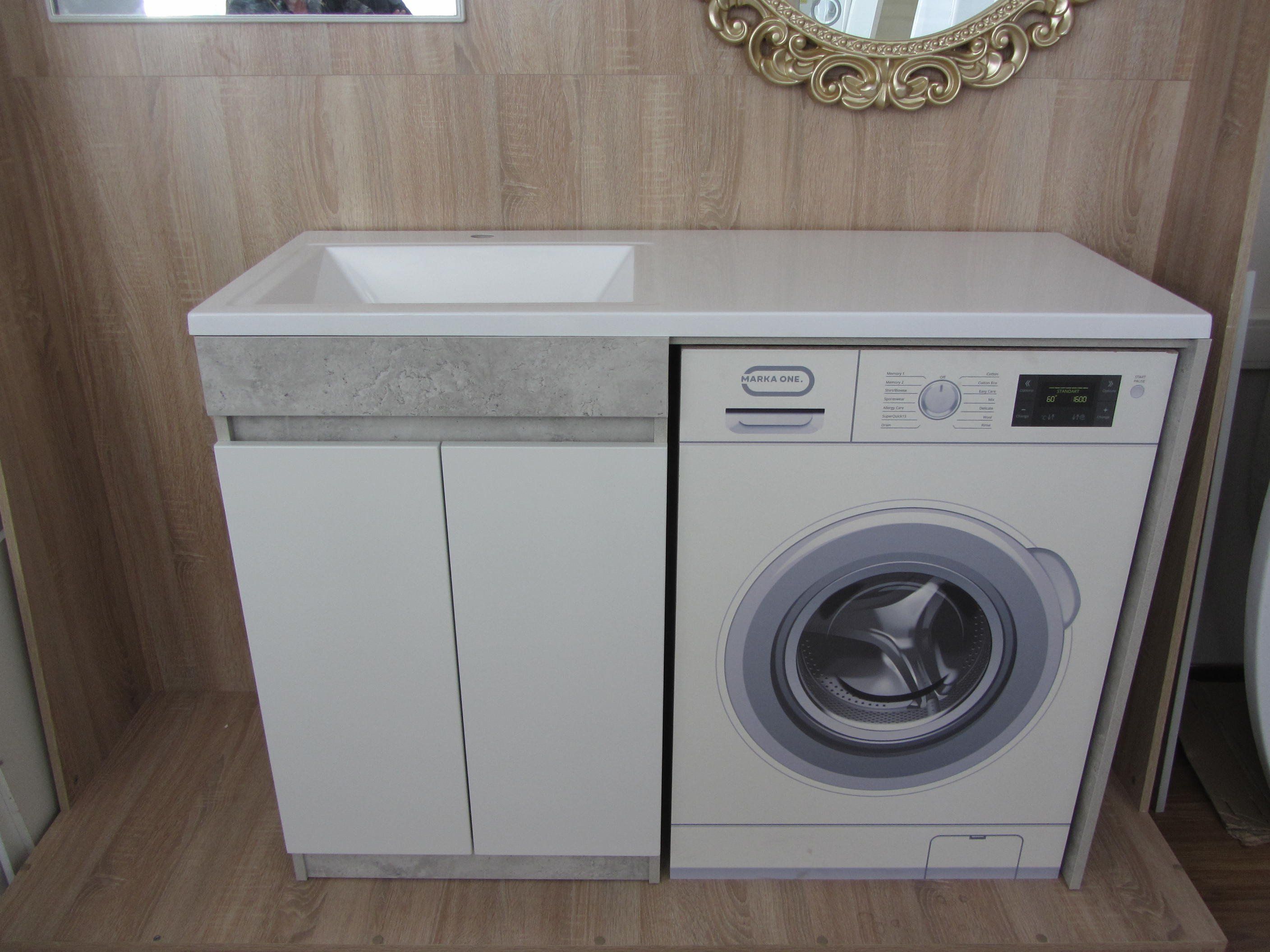 Тумба с раковиной над стиральной машиной Марсал 130 Бетон светлый левая/правая с бельевой корзиной