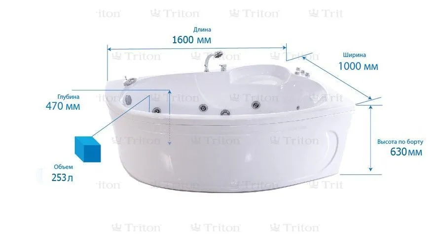 Производство ванн «Тритон» началось в 2000 году. Основной деятельностью компании-производителя является разработка и изготовление акриловых угловых, прямоугольных и сложной формы ванн с последующей установкой гидромассажных и аэромассажных систем. Высокое качество, эксклюзивный дизайн, широкий и ежемесячно пополняемый модельный ряд наших гидромассажных акриловых ванн удовлетворит самый изысканный вкус покупателя. На все ванны, реализованные после 01.09.2013 года, изменен срок действия гарантийных обязательств. Гарантия действует в течение десяти лет для акриловой ванны и пяти лет для дополнительного оборудования (исключение: гарантия на слив-перелив, а также все хромированные покрытия изделий 1 год, гарантия на гибкую подводку, душевой шланг и лейку 1 месяц) с даты приобретения изделия при условии соблюдения требований эксплуатационной документации и при наличии соответствующей отметки в гарантийном талоне об установке изделия квалифицированными службами. При отсутствии вышеуказанной отметки в гарантийном талоне, сроки гарантийных обязательств предприятия изготовителя на дополнительное оборудование сокращаются в два раза. Наши специалисты помогут Вам найти оптимальное решение при выборе акриловой гидромассажной ванны, проконсультируют по различным техническим вопросам, комплектации и ценам.