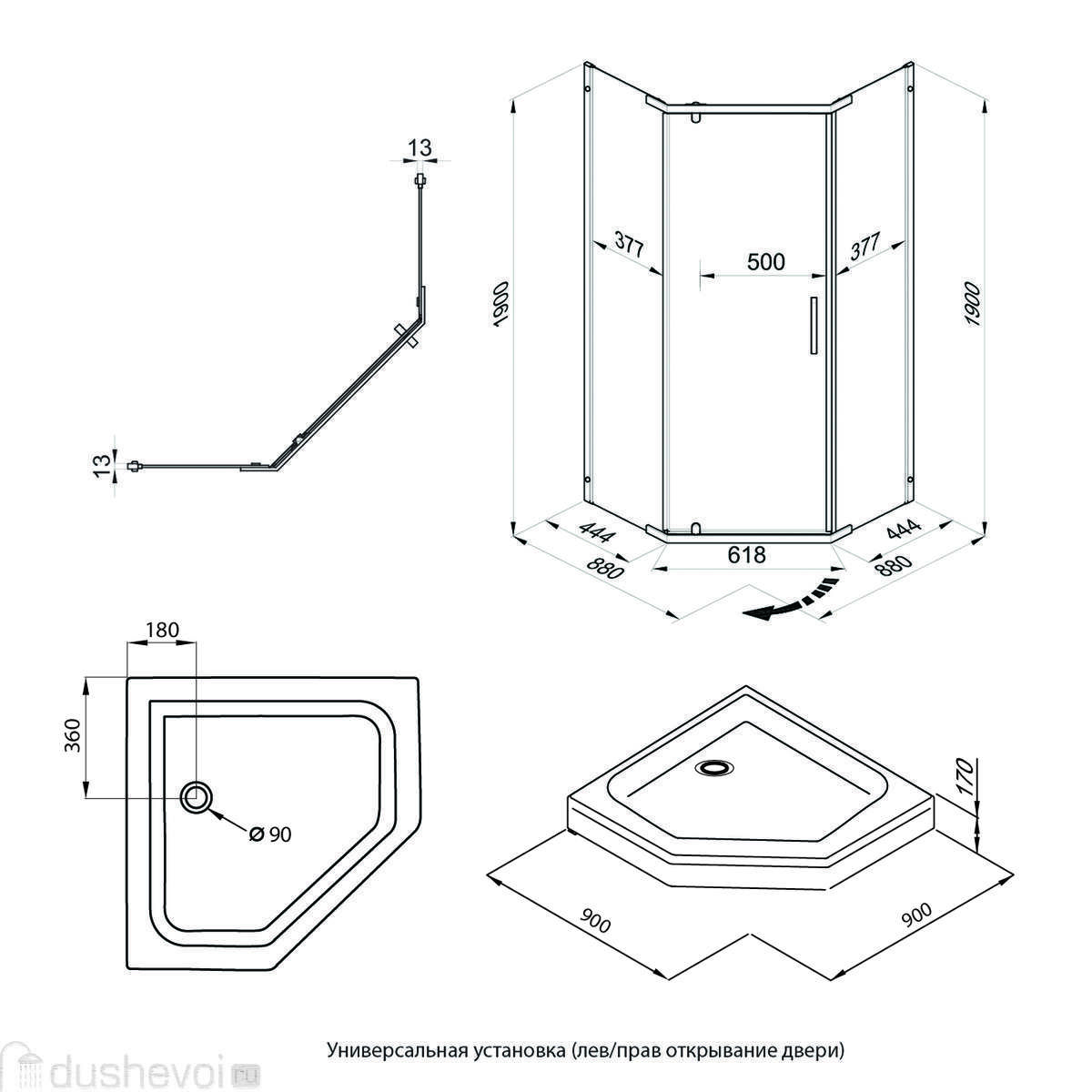 Основная комплектация душевого ограждения, как правило, состоит из поддона и двери. Стенки ванной комнаты закрывают заднюю часть душевого ограждения, по этой причине они устанавливаются в угол комнаты. Также как правило, в комплект душевого ограждения не входят смесители, лейки, сифоны, что дает покупателю сделать самому выбор, какой смеситель покупать для душа.