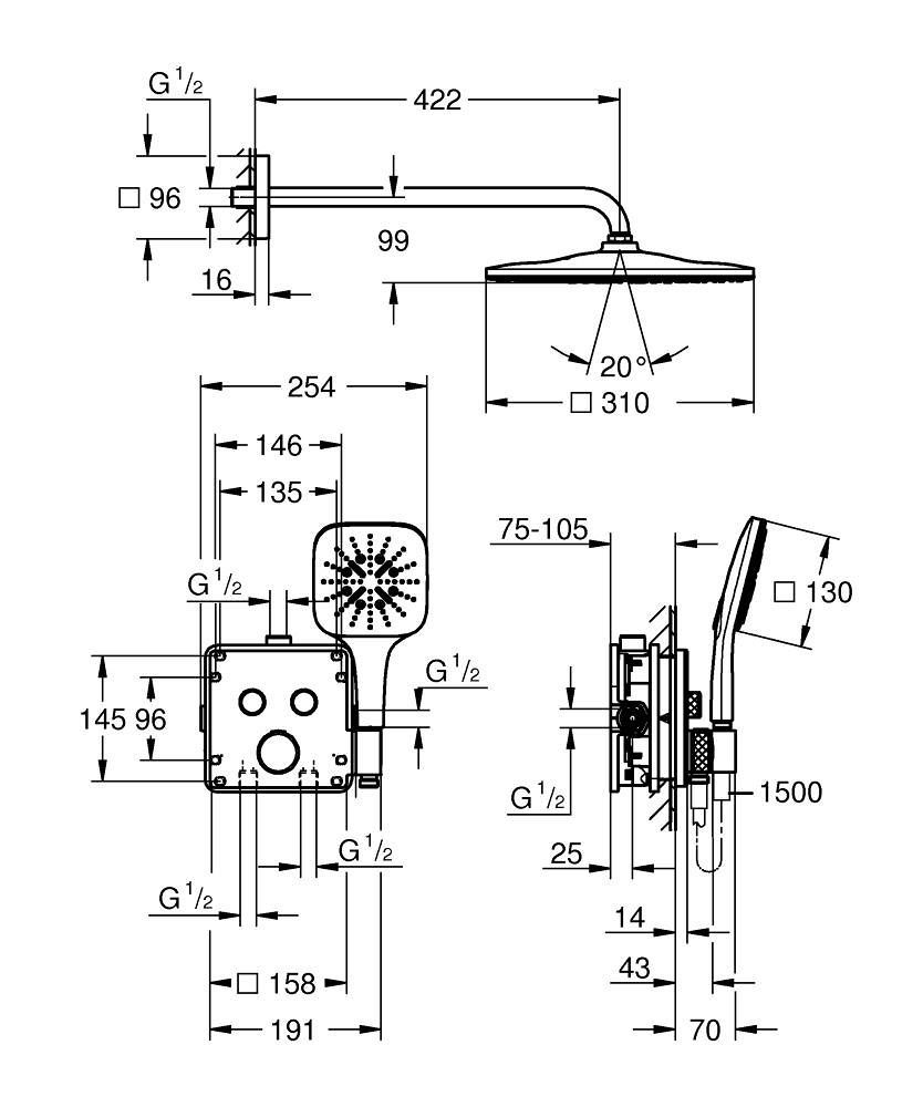 Набор для комплектации душа GROHE Grohtherm SmartControl: встраиваемый термостат, SmartBox, верхний душ, ручной душ, ограничитель расхода, фантомный чёрный (34865KF0)