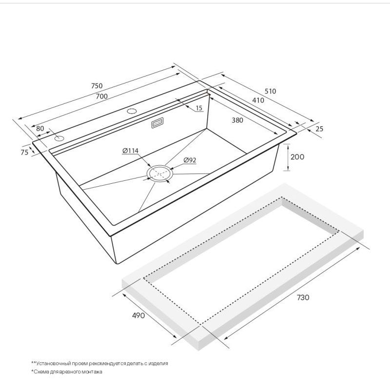 Коллекция Vast-Pro, мойка из нержавеющей стали, установка на столешницу, вровень со столешницей, размер 750х510мм, чаша 700х410х200мм, толщина стали 1,2мм, цвет вороненая сталь, пр-во Китай