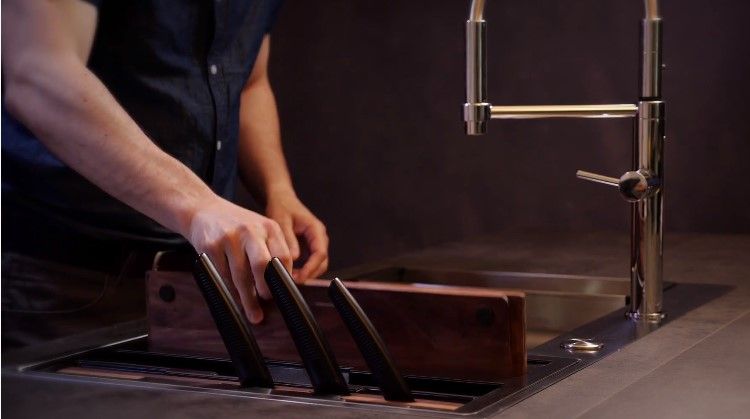 Еще одна технология монтирования – врезная мойка. Её задействуют, если у гарнитура на кухне – цельная верхняя поверхность (доска), в толще которой и выпиливается проём под размещение раковины. Мойки в таком случае могут быть сделаны не только из нержавеющей стали, но и из любого другого материала.