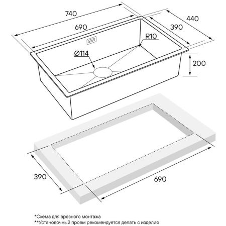 мойка из нержавеющей стали, установка на столешницу, вровень со столешницей, под столешницу, размер 740х440мм, чаша 690х390х200мм, цвет вороненая сталь, пр-во Китай