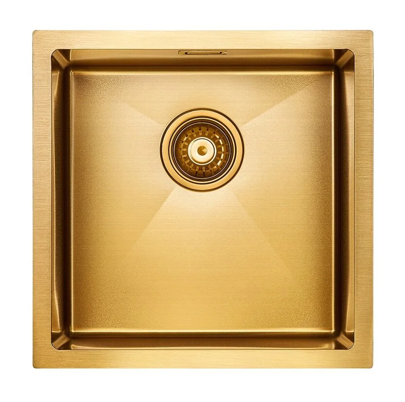 мойка из нержавеющей стали, установка на столешницу, вровень со столешницей, под столешницу, размер 440х440мм, чаша 390х390х200мм, цвет брашированное золото, пр-во Китай