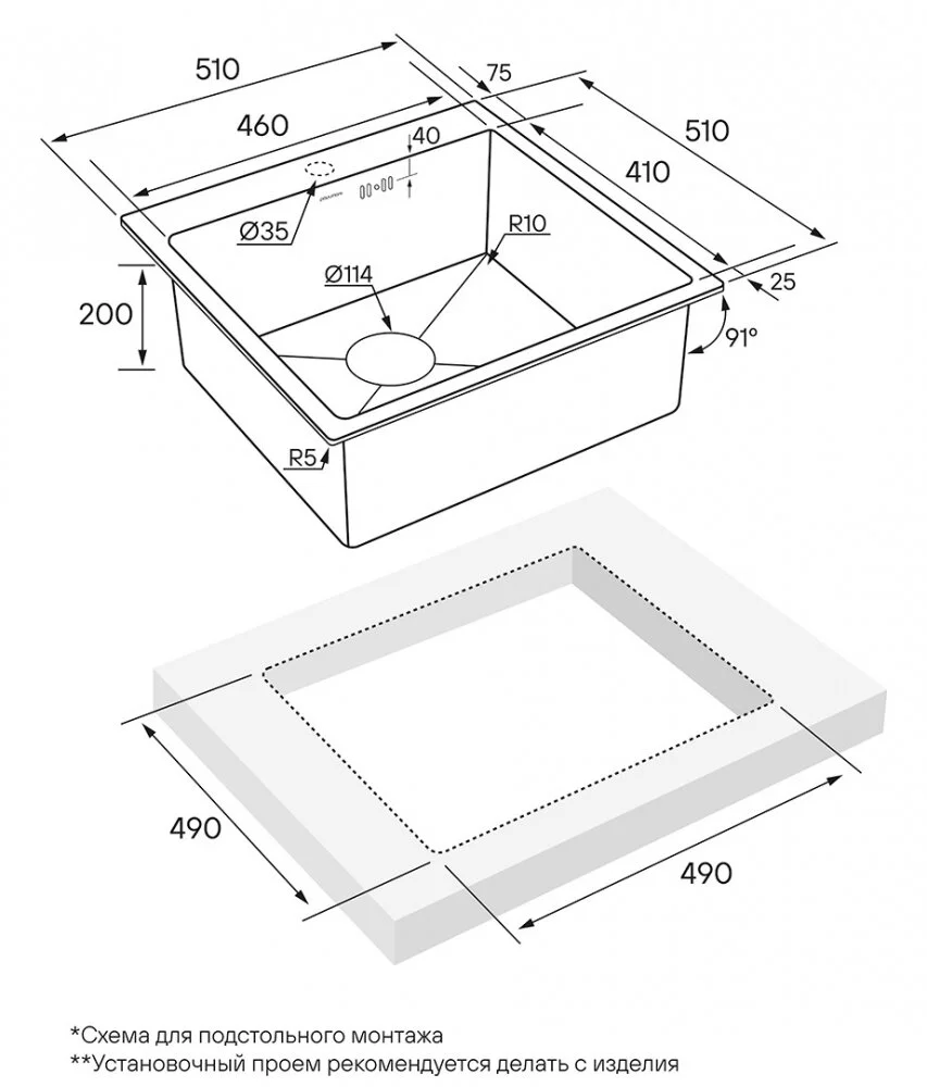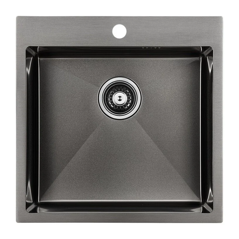 мойка из нержавеющей стали, установка на столешницу, вровень со столешницей, размер 510х510мм, чаша 460х410х200мм, цвет вороненая сталь, пр-во Китай