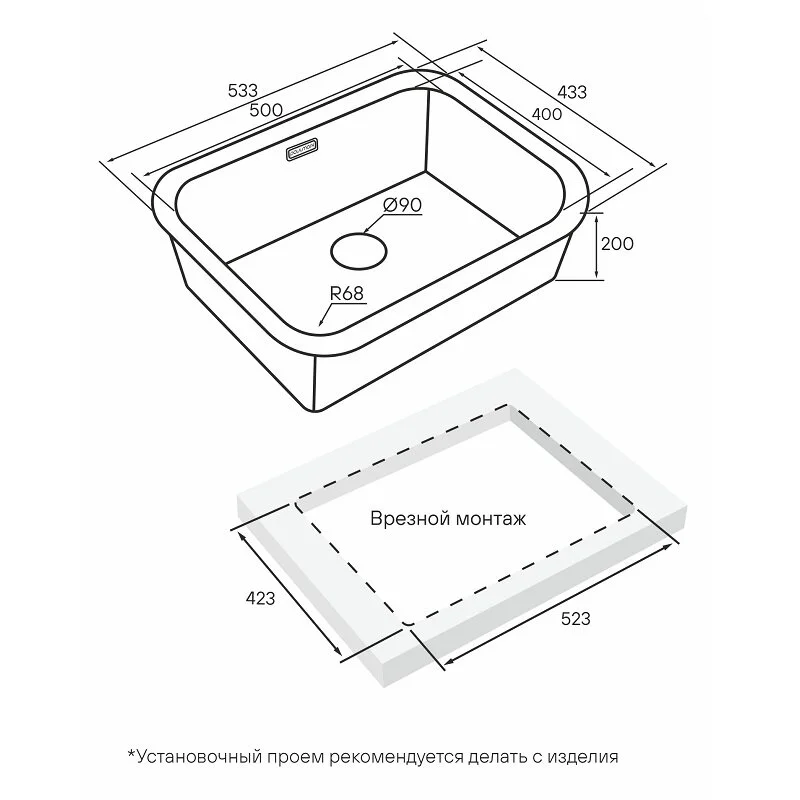 Коллекция Vello, мойка из нержавеющей стали, установка на столешницу, под столешницу, размер 533х433мм, чаша 500х400х200мм, наименование покрытия PVD, цвет матовый черный, пр-во Китай