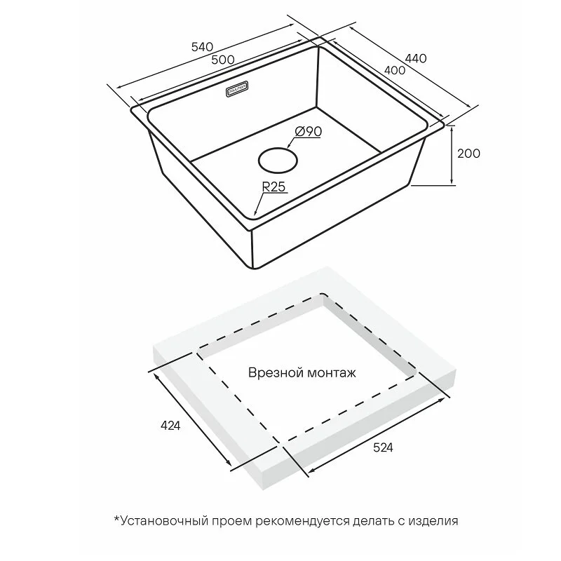 Коллекция Yuni, мойка из нержавеющей стали, установка на столешницу, под столешницу, размер 540х440мм, чаша 500х400х200мм, наименование покрытия PVD, цвет матовый черный, пр-во Китай