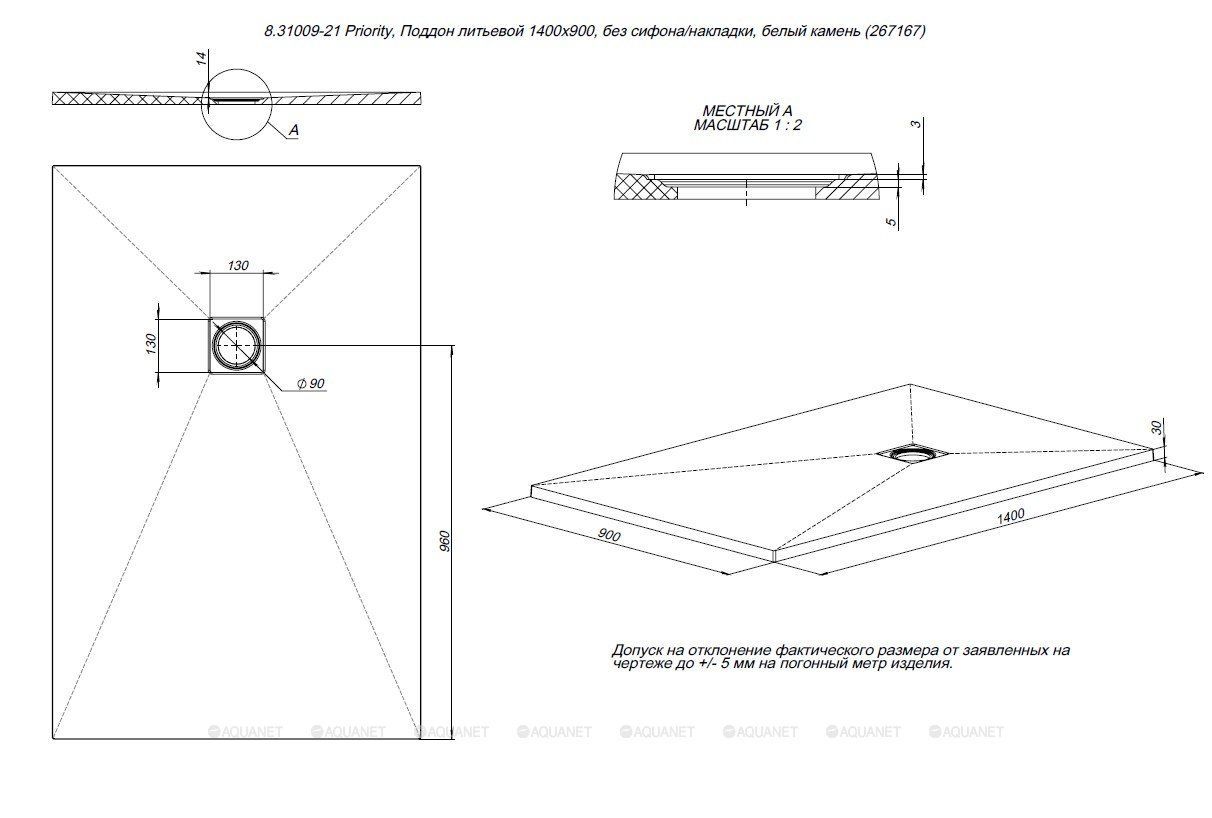 8.31009-21 Priority, Поддон литьевой 1400х900, без сифона/накладки, белый камень