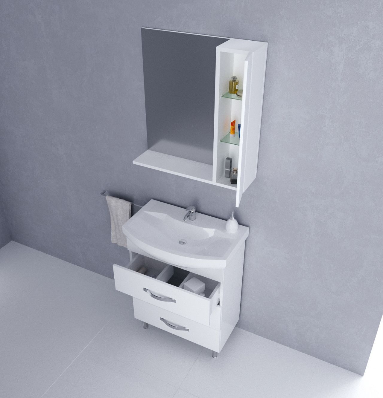 Если вы планируете вешать шкаф над тумбой с раковиной, то необходимо измерить ее ширину и приобрести шкаф таких же габаритов. Такое размещение навесного шкафа будет достаточно удобным и компактным. Такой стандартный навесной шкаф для ванной комнаты можно приобрести сразу в комплекте с тумбовым умывальником. Такой гарнитур избавит от необходимости подбора отдельного навесного шкафчика к интерьеру ванной комнаты.