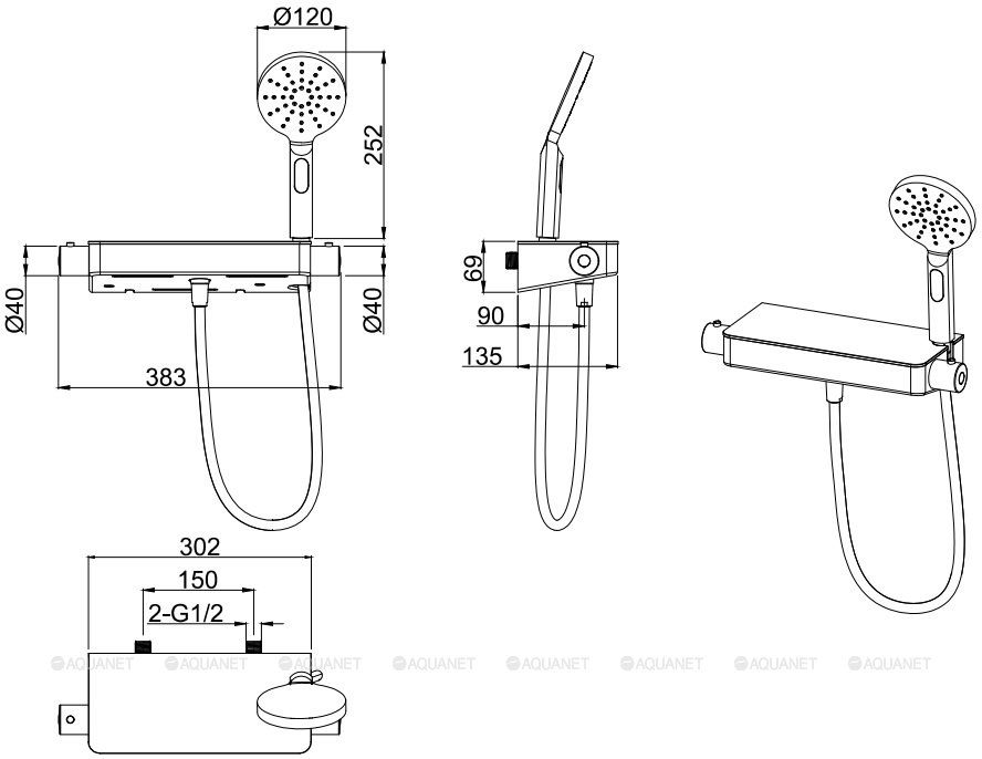 5.11002-31 FANTASY Душевая полка, 302х136мм, термостат, ручной душ 3 режима, черн.мат