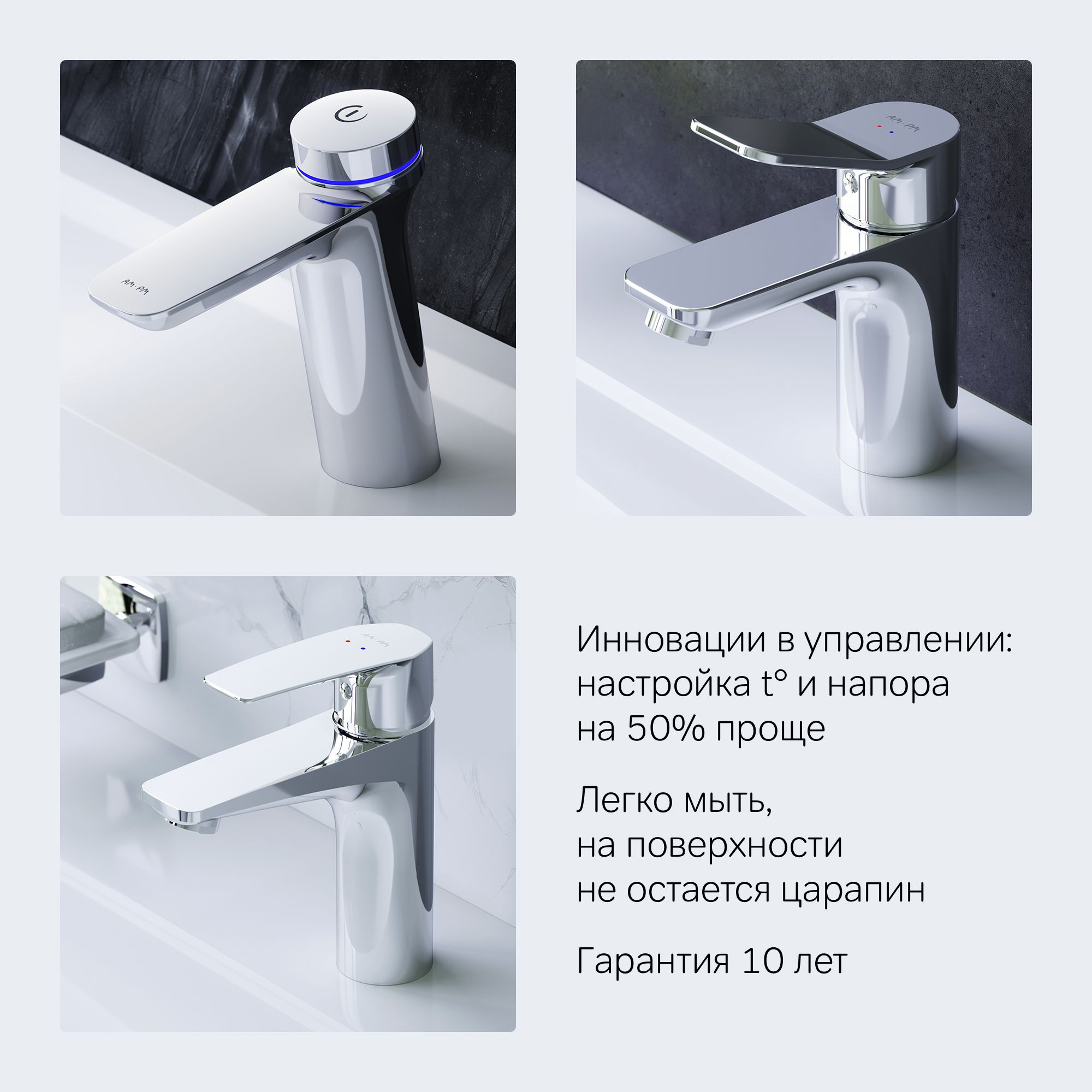 Совершенство, стиль, уникальность – характерный почерк продуктов AM.PM. Созданный в 2010 в Германии, AM.PM стал самым динамичным брендом в отрасли, что находит отражение в десятках престижных международных премий в области дизайна и миллионах довольных покупателей по всему миру. Совмещая лучшие технологии с эмоциональным дизайном, AM.PM создает по-настоящему вдохновляющие продукты, которые может позволить себе каждый. Выбирайте лучшее в настоящем времени!