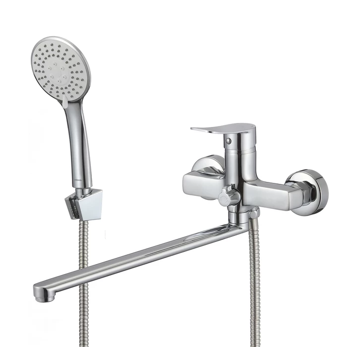 Смеситель для ванны с длинным изливом (350 мм), однозахватный, латунь, никель-хромовое покрытие, керамический картридж 35 мм, пластиковый аэратор, керамический поворотный дивертор. В комплекте: лейка Ø100 мм из ABS-пластика (3 режима), держатель, шланг в металлической оплетке 150 см, эксцентрики c отражателями, комплект уплотнителей. Упаковка: картонная коробка, индивидуальный мешок